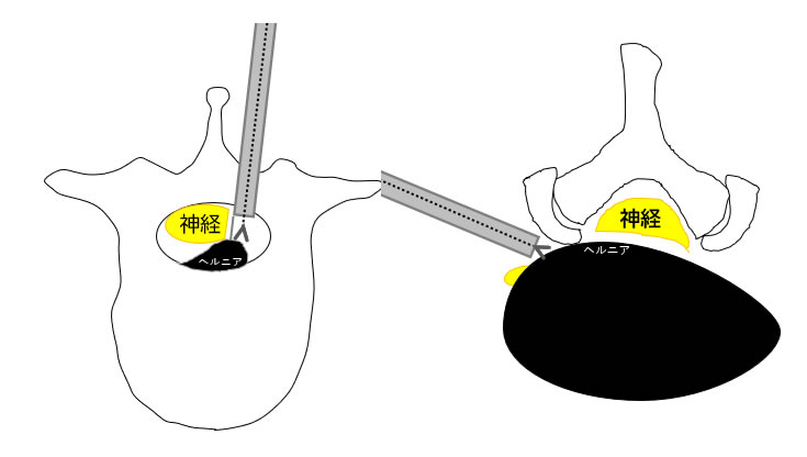 腰椎椎間板ヘルニアの場合は腰椎高位やヘルニアの位置によってアプローチを変更します。