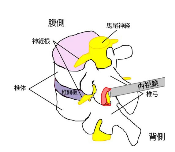 後方から内視鏡でアプローチする場合は椎弓の 間の 黄色靭帯、 および最低限の椎弓を切除して 、 内視鏡を進入させます。