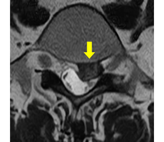 | 椎間板のみが突出し、神経を圧迫した状態です。10~50 歳代に多いです。 | ![]() (腰椎を輪切り にした図) |