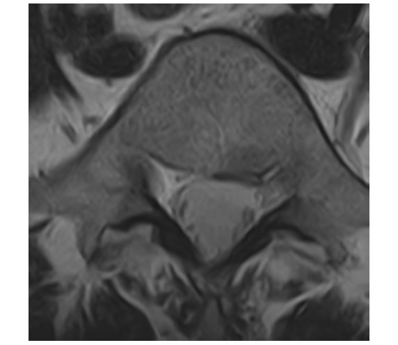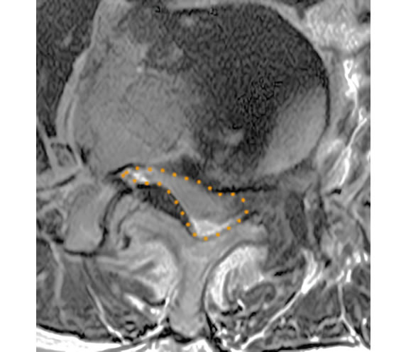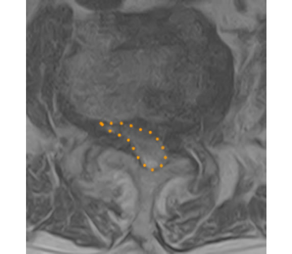 | 椎間板以外に、靭帯や骨によって神経が圧迫されている状態となります。50歳以上に多いです。 | ![]() (腰椎を輪切りにした図) |