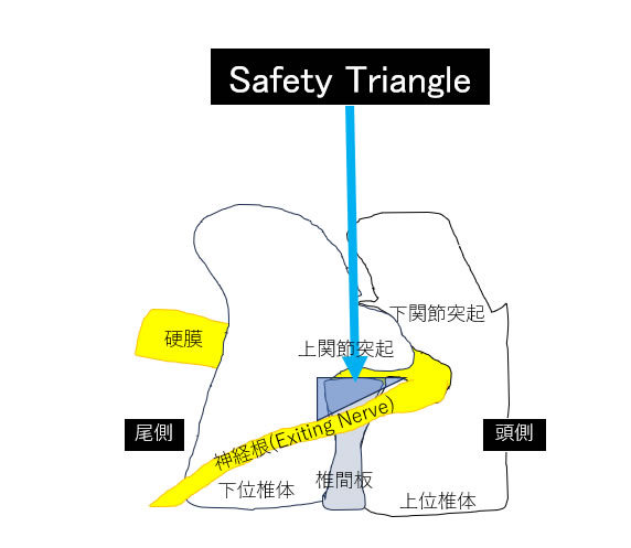 側方から内視鏡でアプローチするときに、神経を損傷しないよう Safety Triangle(下図参照)から内視鏡を進入させます。